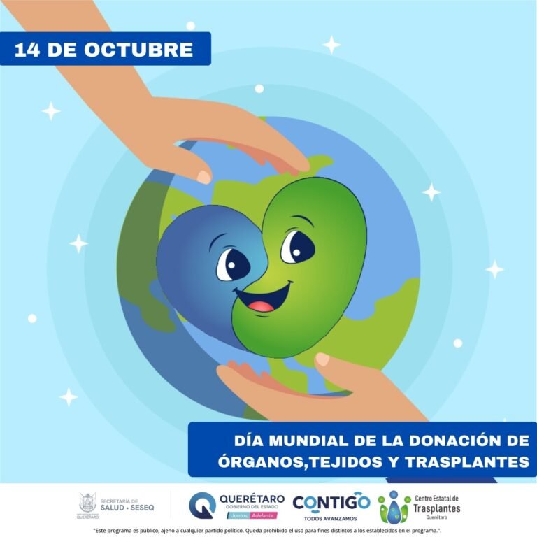 La Secretaría de Salud del Estado de Querétaro se une este 14 de octubre a la conmemoración del Día Mundial de la Donación de Órganos, Tejidos y Trasplantes, fecha instaurada por la Organización Mundial de la Salud (OMS) junto con instituciones internacionales de trasplantes. Esta efeméride tiene como propósito promover la cultura de la donación y sensibilizar a la población sobre la importancia de este acto generoso que puede salvar y transformar vidas.
